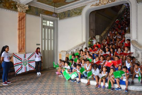 Inaugurado em l926, o Paço Municipal Maria Quitéria recebeu, na manhã desta segunda-feira, 3, a visita de alunos do Ensino Fundamental da Escola Jerusalém, que brindaram o prefeito Colbert Martins Filho, secretários e funcionários da Prefeitura com o coro de 120 vozes entoando o Hino à Feira.