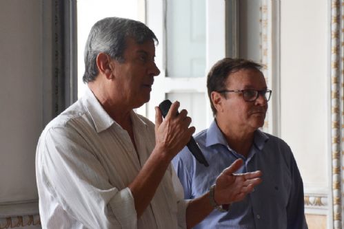 Acompanhado dos secretários Antônio Carlos Borges Júnior (Trabalho, Turismo e Desenvolvimento Econômico) e Mário Borges (chefe de Gabinete), o prefeito Colbert Martins Filho recebeu os estudantes, acomodados nos degraus da escadaria do saguão da Prefeitura.